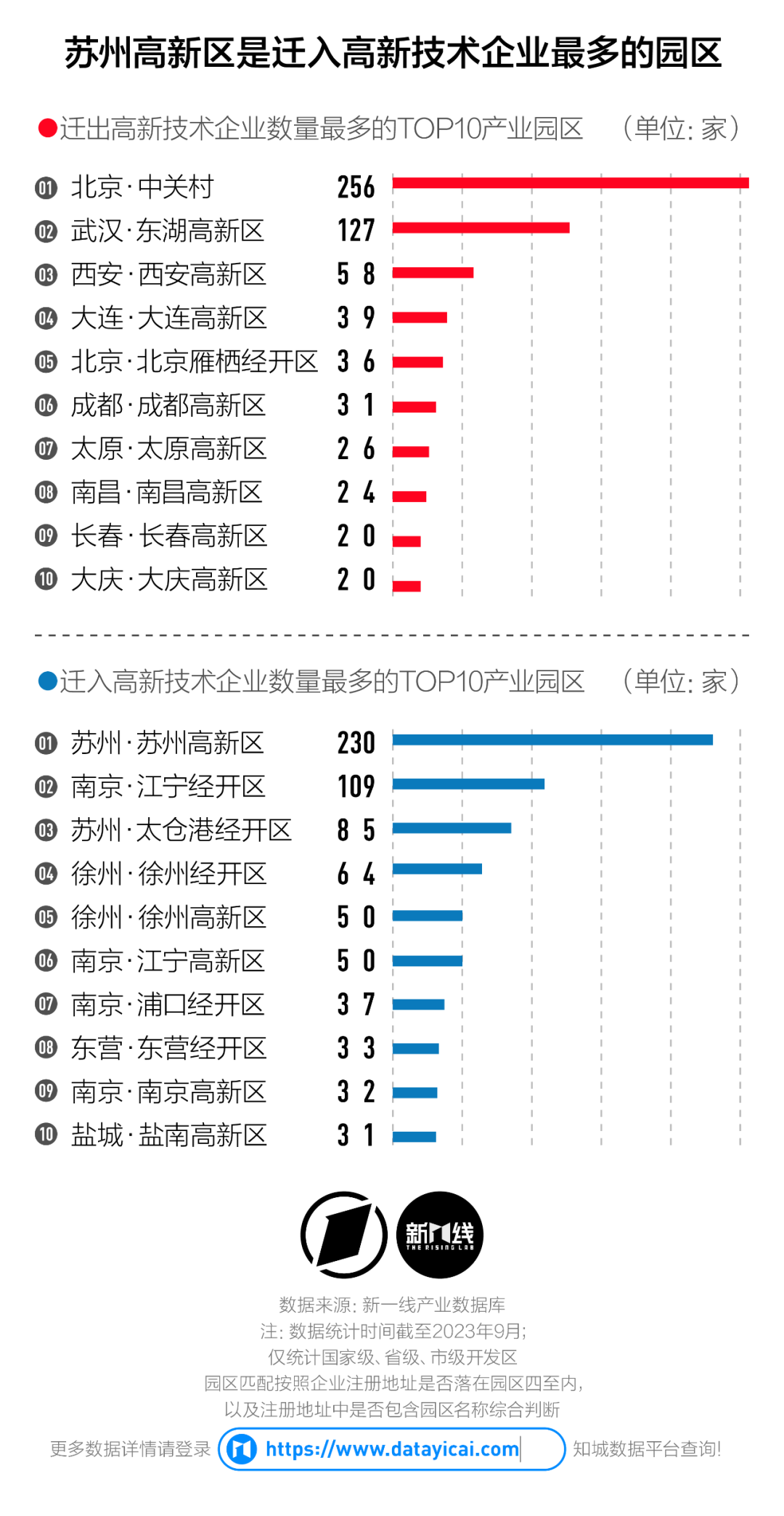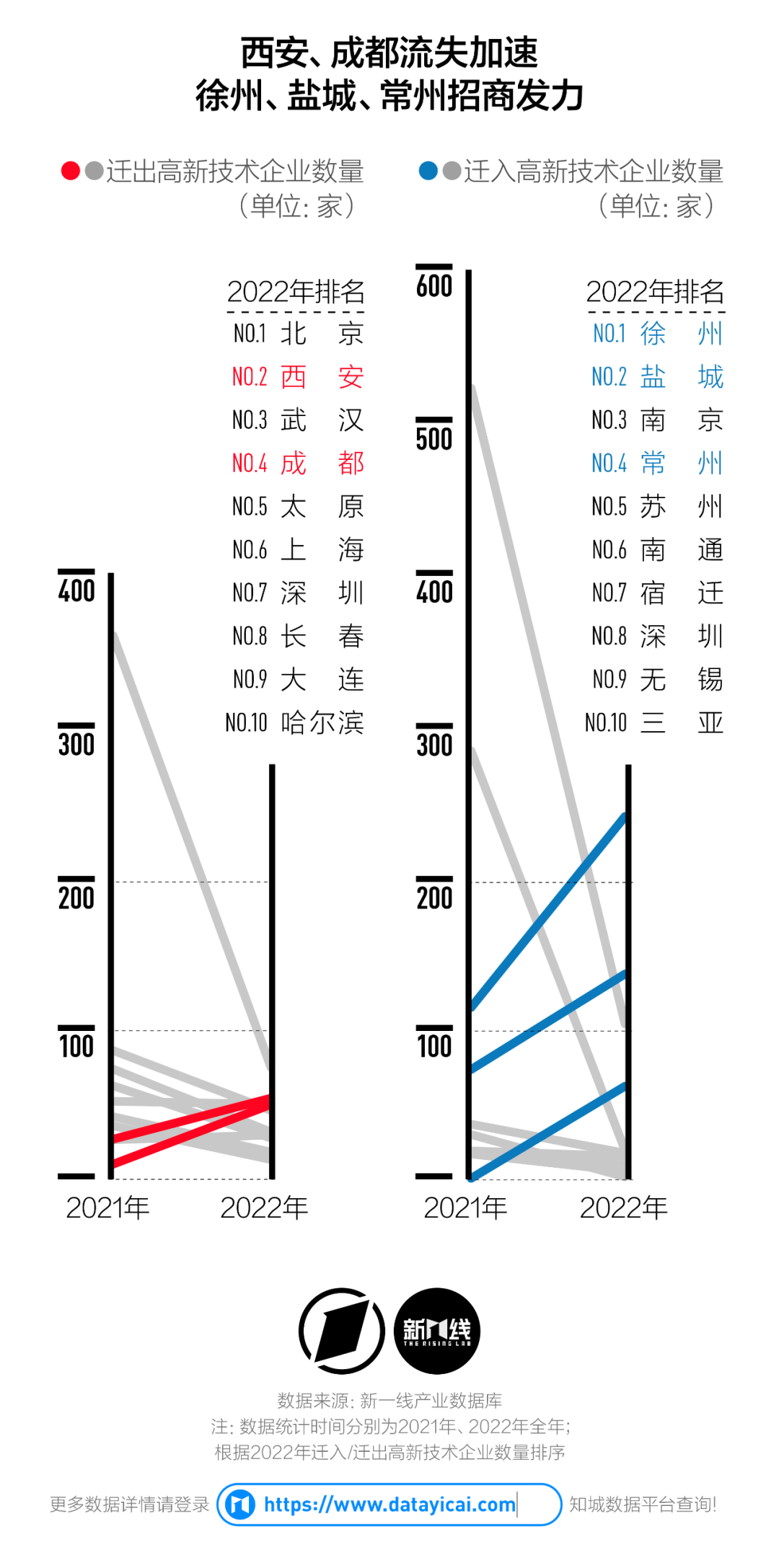 部分新一線城市的企業(yè)流失開始加速。西安、成都遷出的高新技術(shù)企業(yè)數(shù)量連年增加——2022年成都遷出了53家,是前一年的3倍多;西安遷出了57家,位列全國第二名。