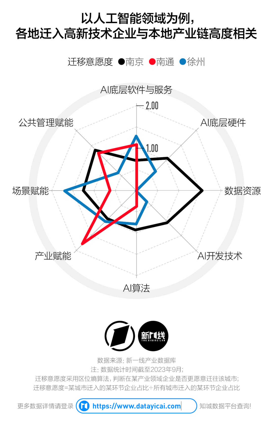 遷入人工智能相關(guān)高新技術(shù)企業(yè)數(shù)量最多的三座城市,分別是南京、徐州和南通。其中,位于中上游環(huán)節(jié)——如數(shù)據(jù)資源、AI開發(fā)技術(shù)的企業(yè)更偏好科教資源豐富的南京。