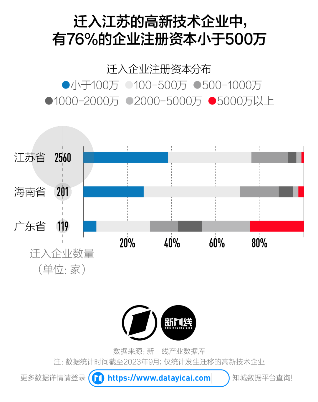 遷入江蘇的2560家高新技術(shù)企業(yè)中,注冊資本小于500萬的小微企業(yè)占到76.21%。海南作為最年輕的自貿(mào)區(qū),稅收優(yōu)惠政策依然是其吸引企業(yè)的重要手段之一,在遷入企業(yè)的注冊資本分布上也與江蘇呈現(xiàn)出類似的結(jié)構(gòu)。