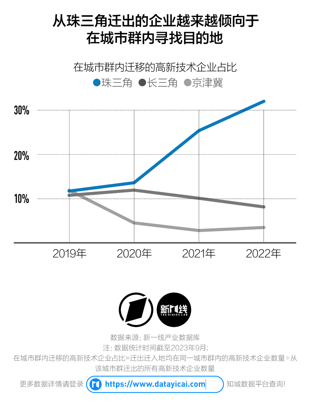 2022年,從珠三角城市離開的高新技術(shù)企業(yè)中,有31.94%直接就近遷入了城市群內(nèi)的其他城市。相比之下,長三角、京津冀未能將遷出企業(yè)留在城市群內(nèi)部,且集中表現(xiàn)出從一線城市向低線城市單向流動(dòng)的特征。